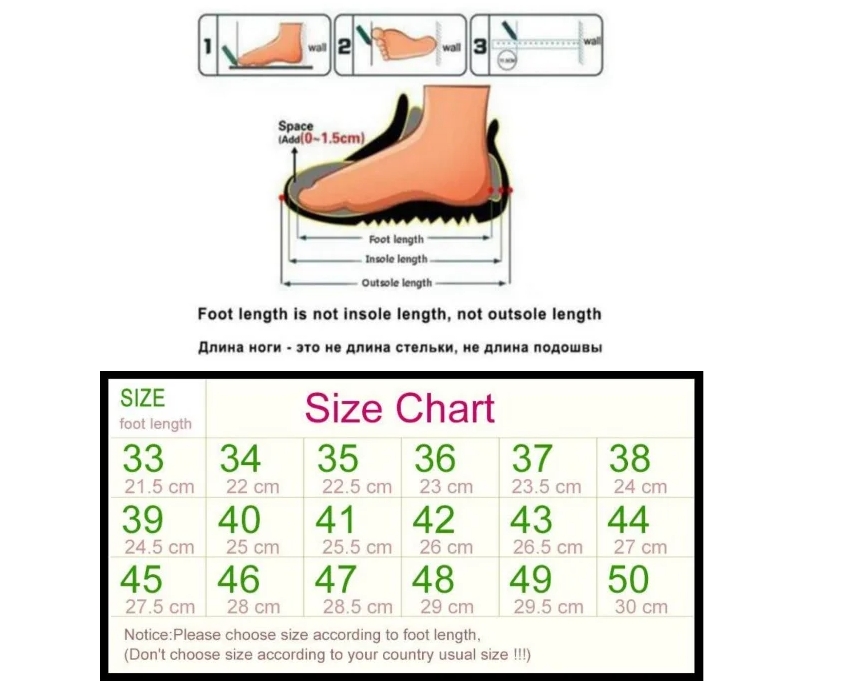 1. Choose the size according to your foot length (don't choose the size according to the usual size in your country!!!)