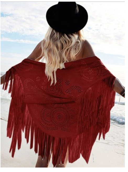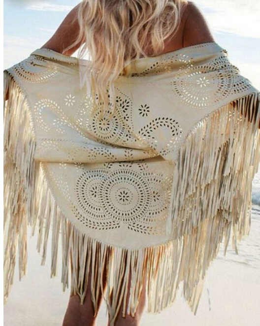 Women Fashions Faux Suede Leather Cut Out Summer Beach Cover Up Kimono Long Fringes Tassels Shawls