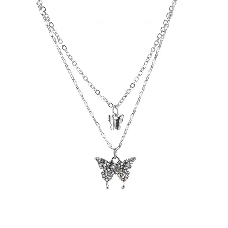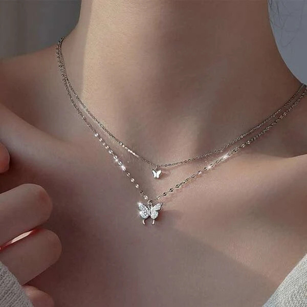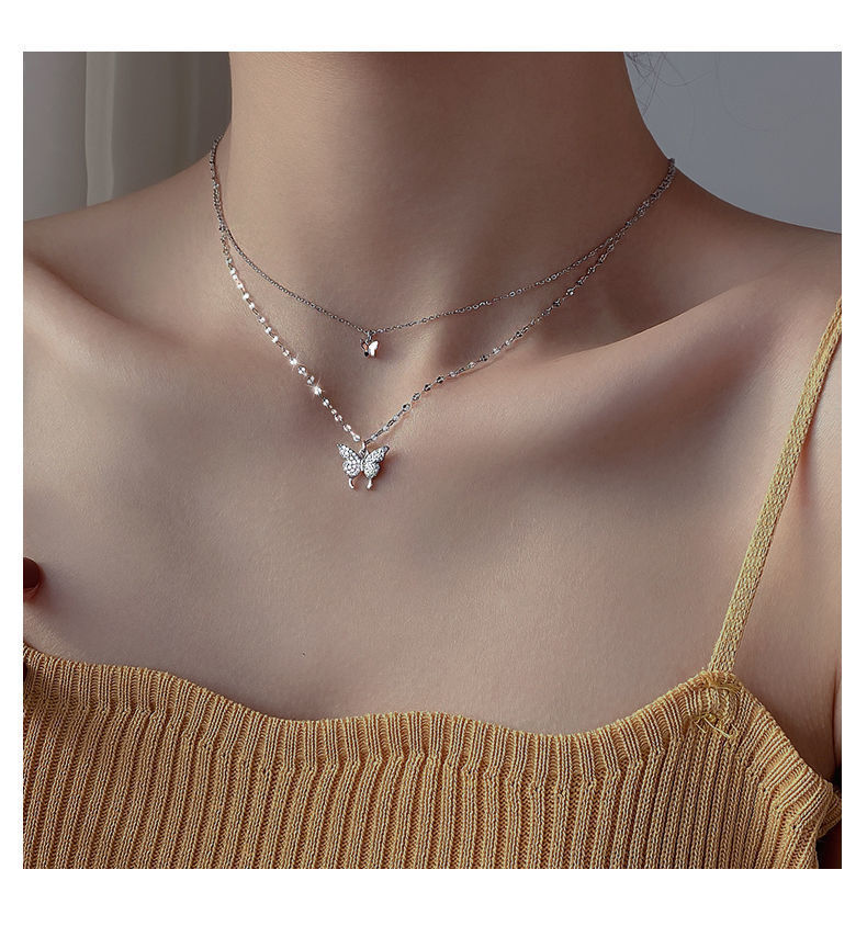 Diamond Butterfly Pendant Necklace Double-layer stacked Clavicle Chain for Women Girls