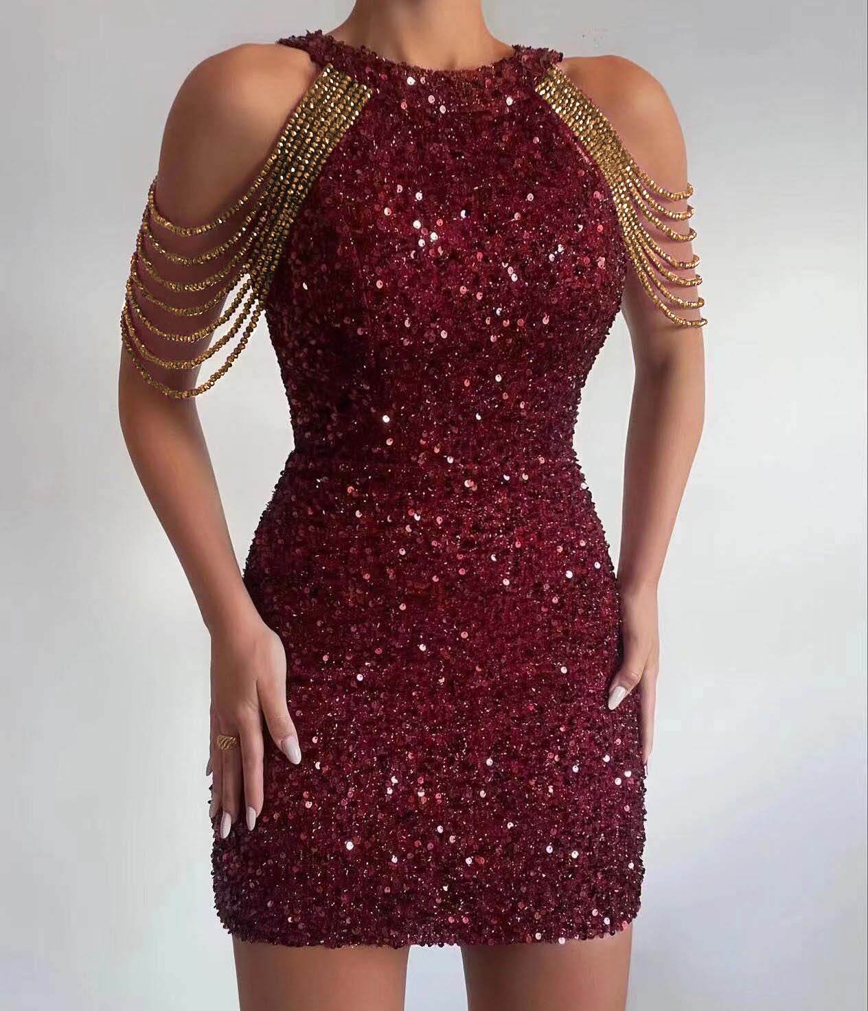 Spring/Summer New Fashionable Hanging Neck Sexy Crystal Chain Hip Wrapped Glitter Dress Mid Waist Evening Dress