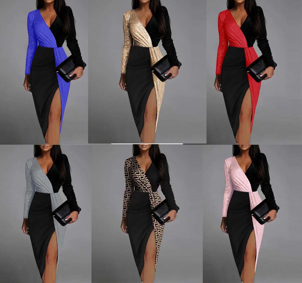 Two color black gold ethnic style high waist solid color temperament long sleeve waist cinched dress